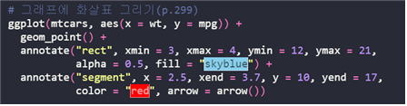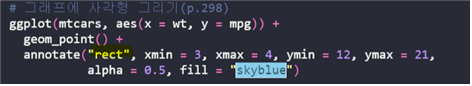 | annotate(“모양”, xmin = x축 시작, xmax = x축 끝, ymin = y축 시작, ymax = y축 끝) |