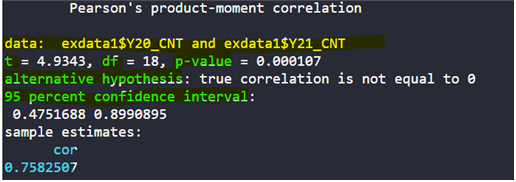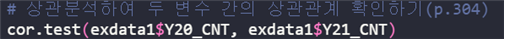 | cor.test(테이블명$변수명1, 테이블명$변수명2) |