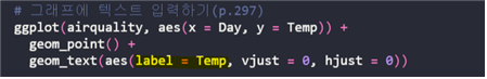 | geom_text(aes(label = 레이블, vjust = 세로 위치, hjust = 가로 위치) |