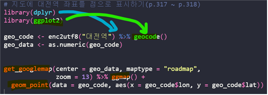 - 지도에 점찍기 : ggmap() + geom_point()