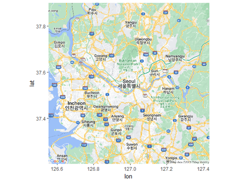 - ggmap 패키지는 지도 시각화를 위한 패키지로 구글 지도를 활용할 수 있는 여러 함수를 포함한다.