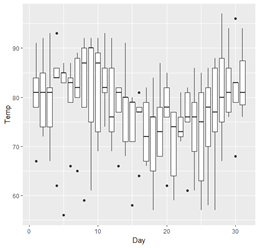 | ggplot(데이터 세트, aes(x=?, y=?), group =?) + geom_boxplot() |