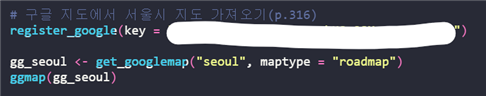 - 구글 지도 API에서 발급받은 API 키를 사용하면 R 스튜디오에 구글 지도를 가져올 수 있다.