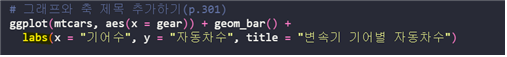 | labs(x = “x축명”, y = “y축명”, title = “그래프 제목”) |