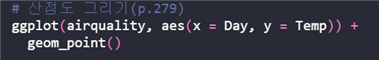 | ggplot(데이터 세트, aes(x=?, y=?)) + geom_point() |