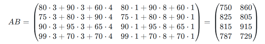 - 두 행렬 A와 B의 곱 AB는 A의 행과 B의 열 간의 스칼라 곱의 합